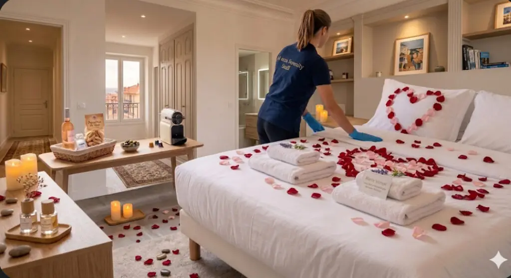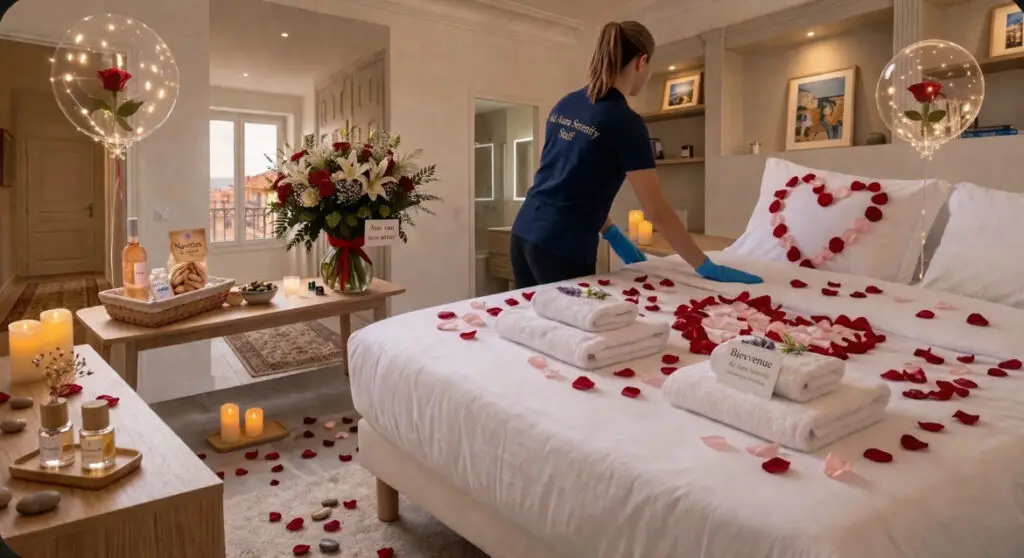 Une atmosphère romantique raffinée, idéale pour une surprise, une arrivée ou un séjour en couple. Scénographie romantique Votre espace est délicatement transformé grâce à une mise en scène florale élégante composée de pétales de rose stabilisée ou séchées premium, disposées harmonieusement sur le lit pour créer une ambiance intime et chaleureuse.